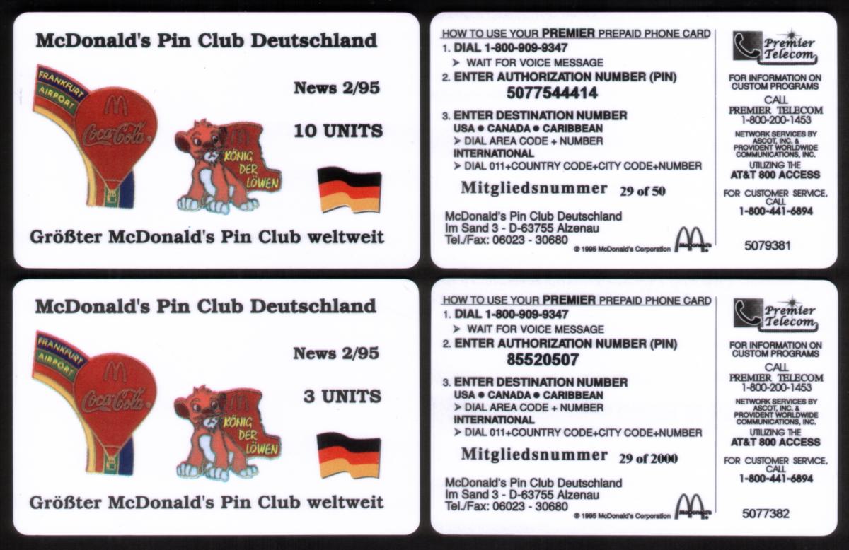 Set of 1990s German promotional cards featuring McDonald''s, Coca-Cola, Disney''s Simba, and prepaid phone functionalities with collectible appeal. |