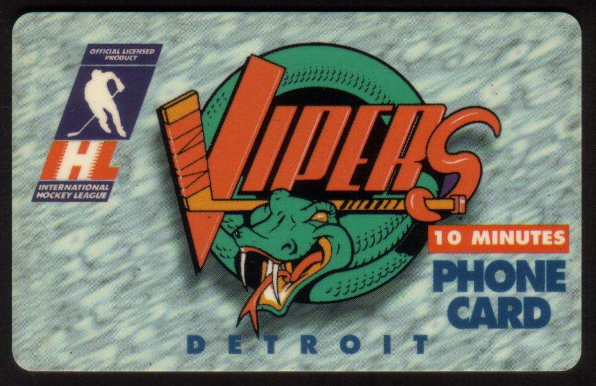 The card also contains branding from RSI Telecom (MSM), the company responsible for producing or distributing the card. The overall design integrates the sports logos and hockey motifs with a clean layout and white border that frames the central imagery and text clearly. The presentation focuses entirely on the Detroit Vipers’ branding within the context of the International Hockey League.