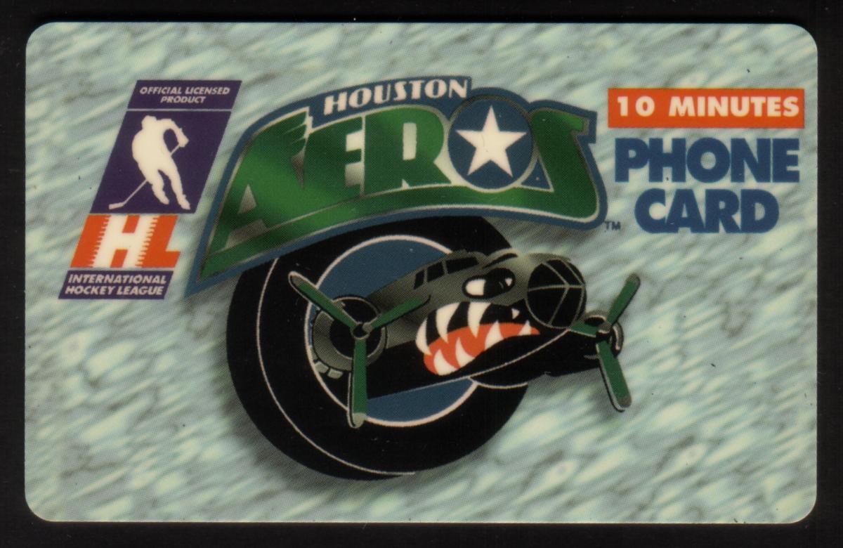 This collectible chip card features the logo of the Houston Aeros, a professional hockey team from Texas that competed in the International Hockey League (IHL). The team logo is prominently displayed in the center of the card, showcasing the stylized "Aeros" text and incorporating the imagery of a propeller aircraft, reflecting the team’s connection to aviation. The background includes a stylized propeller, emphasizing the aviation theme tied to the Houston Aeros identity.