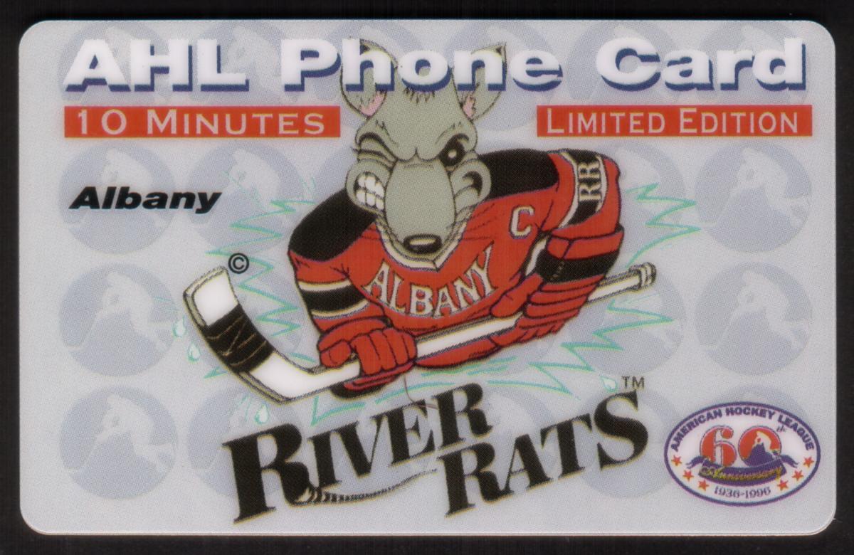 This is a collectible item tied to hockey sports memorabilia, specifically related to the Albany River Rats team and the American Hockey League’s 60th anniversary celebration. No player images or numbers appear on the card, focusing instead on the team logo and commemorative text.