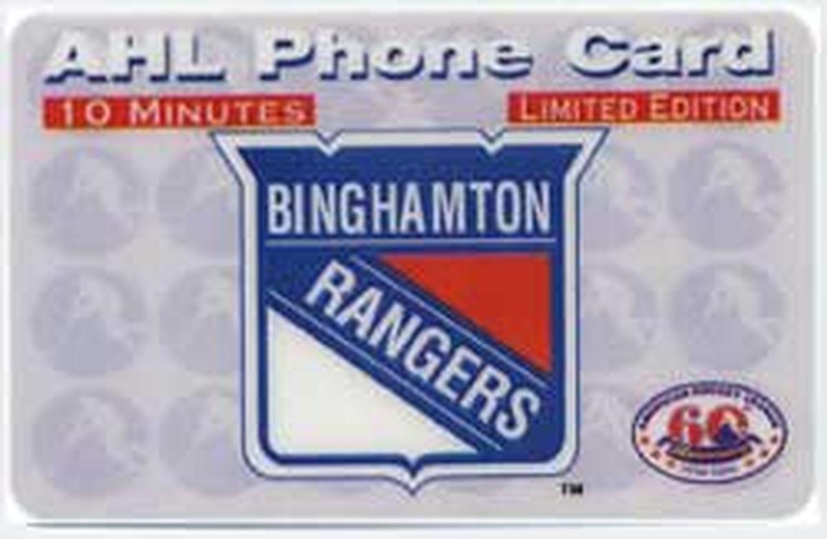 The collectible phone card commemorates the 60th Anniversary of the American Hockey League (AHL). It features the Binghamton Rangers logo prominently on the front, centered against a black background that creates strong contrast, making the team emblem stand out clearly. The top left corner displays text in white that reads "60th Anniversary American Hockey League," with "60th Anniversary" in bold larger font and "American Hockey League" in smaller, capitalized letters beneath. At the bottom left of the card, the text "10m" indicates the card’s telephone value.