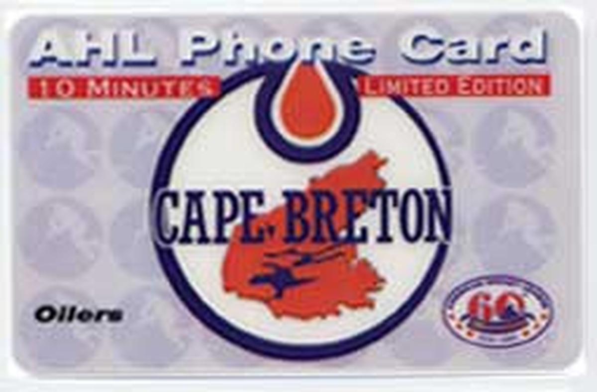 The design highlights the sports theme of hockey, specifically within the AHL context, incorporating official sports logos and team emblems. The Cape Breton Oilers logo is centrally displayed, capturing the team’s branding linked to the league’s milestone anniversary. The card’s visual elements and text confirm its connection to professional hockey and telecommunications.
