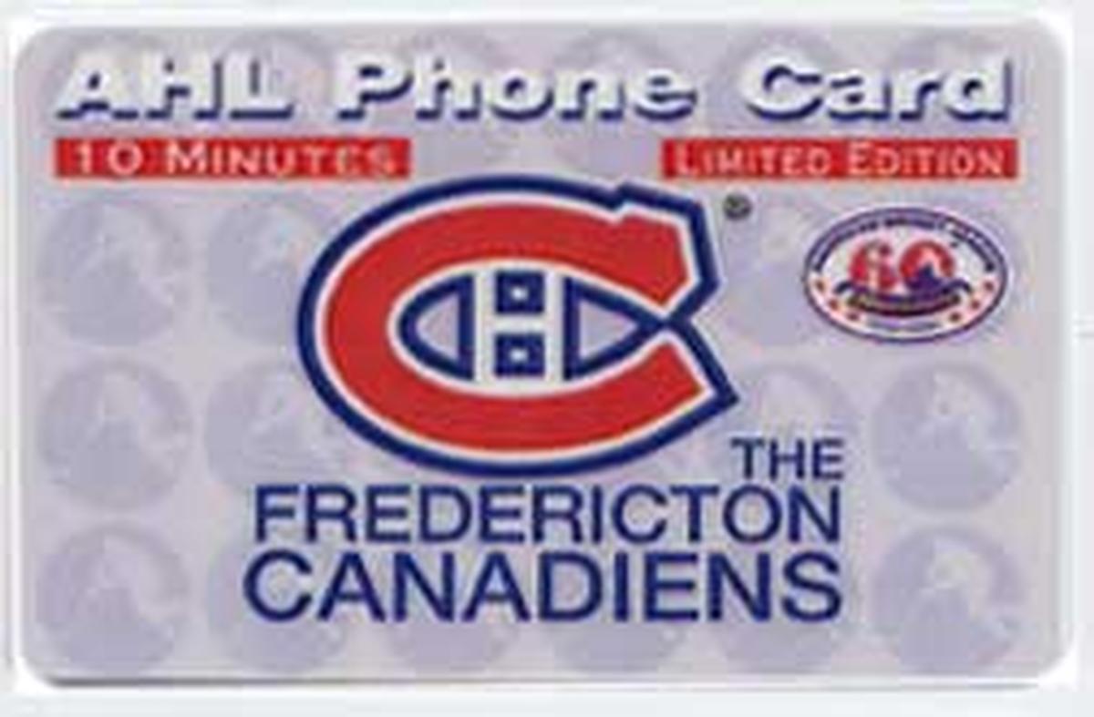 This collectible phone card commemorates the 60th anniversary of the American Hockey League (AHL). It prominently features the logo of the Fredericton Canadiens, an AHL hockey team. The logo includes the stylized text "Fredericton Canadiens" along with the team’s distinctive emblem, which integrates the iconic "C" with a hockey stick element.