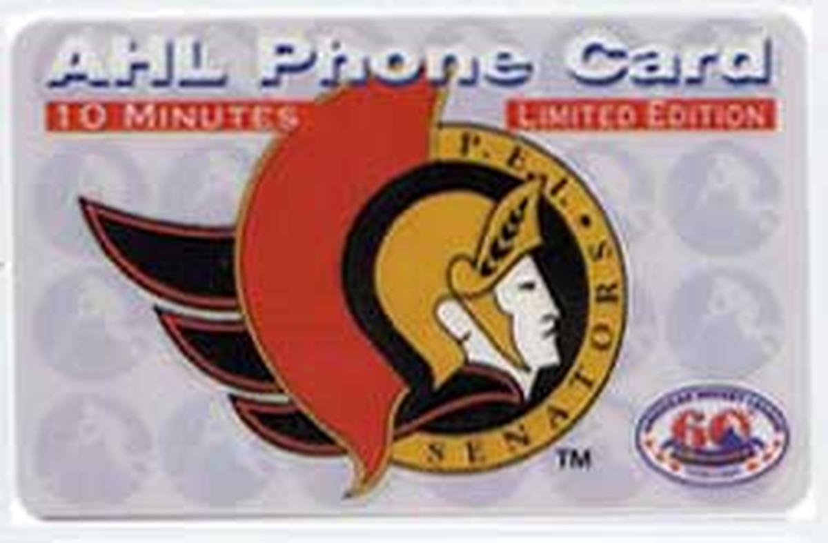 The overall design is clean and focused on promoting the P.E.I. Senators hockey team and the AHL’s milestone anniversary. The card uses bold typography for clear legibility of all texts, including the team name, anniversary note, and corporate branding. The image emphasizes hockey sports logos and team pride connected to Prince Edward Island.