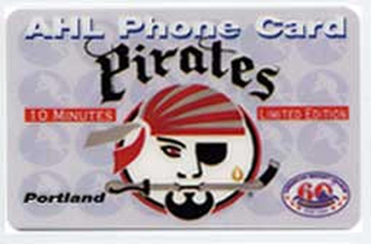 The card includes hockey-related imagery and branding, set against a clean layout that highlights the Portland Pirates logo in the center. The text on the card refers to RSI Telecom and MSM, indicating the issuing telecom entity connected to this collectible chip card. The overall design reflects the combination of professional hockey and telecommunications industry elements.