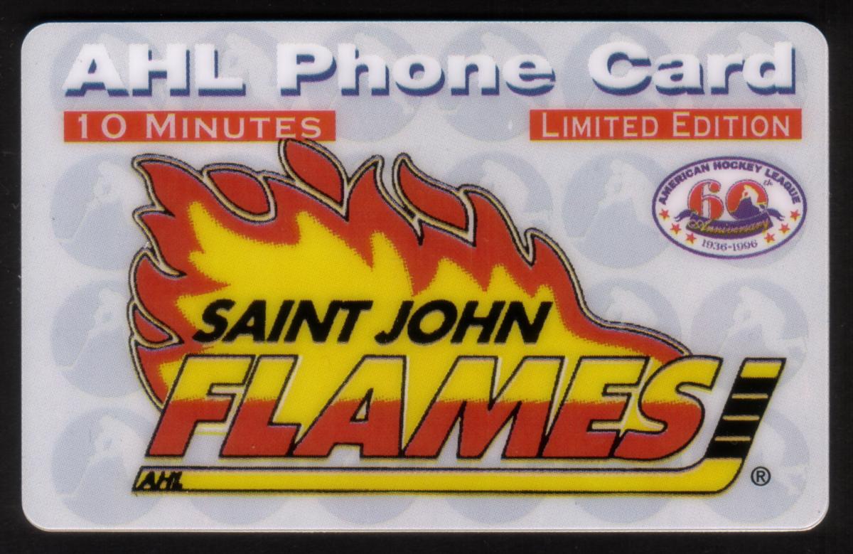 This collectible card features the logo of the Saint John Flames, a former ice hockey team that competed in the American Hockey League (AHL). The card commemorates the 60th anniversary of the AHL, highlighting the league's long history and its teams. The Saint John Flames logo is prominently displayed in the center, featuring a stylized flame design with bold red, white, and black colors.