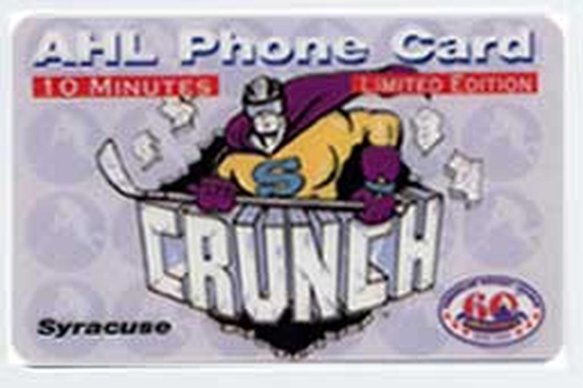 Additional phone cards display a Providence Bruins logo as a black “P” with golden spokes surrounding it, Rochester Americans with a red, white, and blue shield and stars, Saint John Flames with bold red and yellow text designed like flames, St. John's Maple Leafs featuring a dark blue maple leaf with the team name inside, Springfield Falcons showcasing a fierce falcon head, Syracuse Crunch depicted by a muscular hockey player breaking chains above the team name, and Worcester IceCats highlighted by a green cat holding a hockey stick. The Portland Pirates card has a pirate’s face wearing a red and white striped bandana with a hockey stick clenched in his teeth. The last card in the set is dedicated solely to the American Hockey League’s 60th Anniversary emblem with the years 1936-1996 encircled with stars and a stylized hockey player in red.