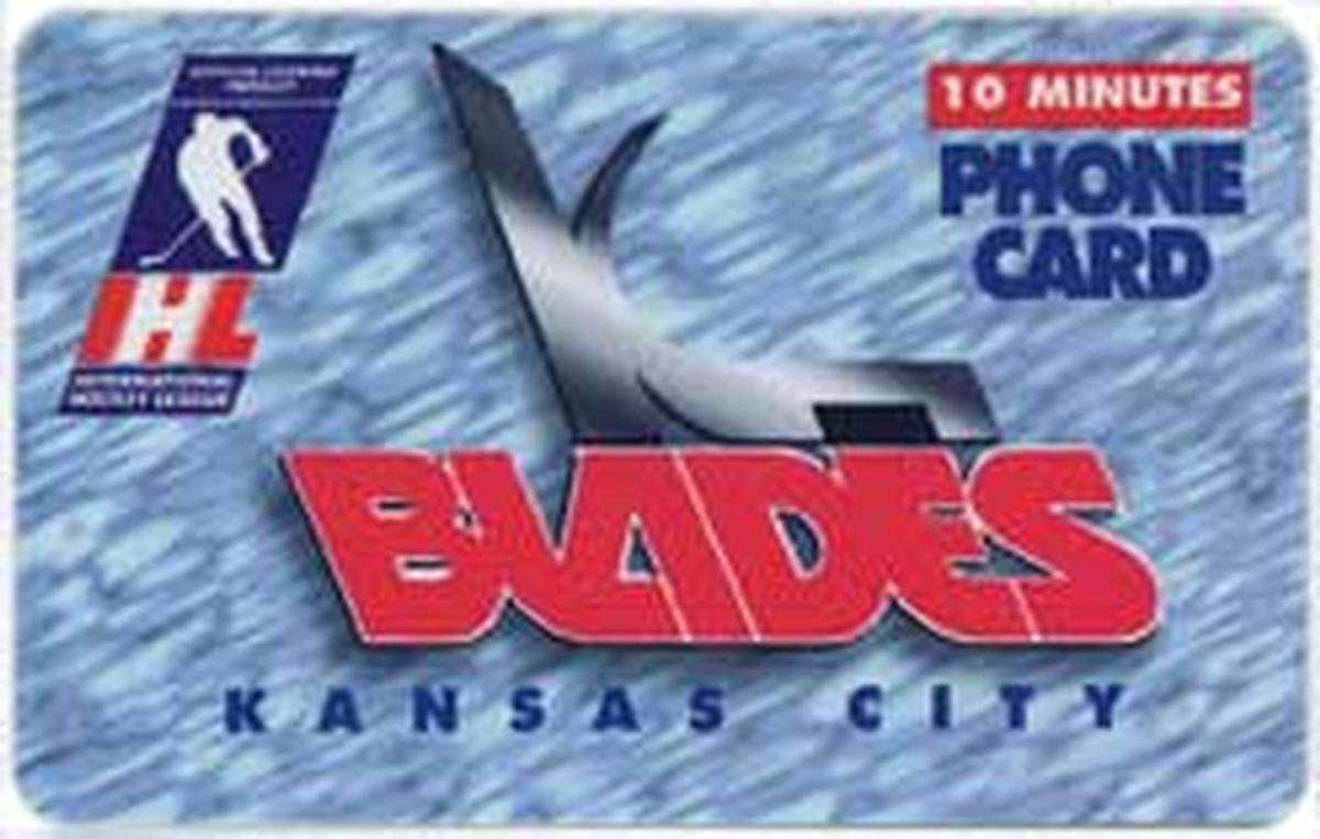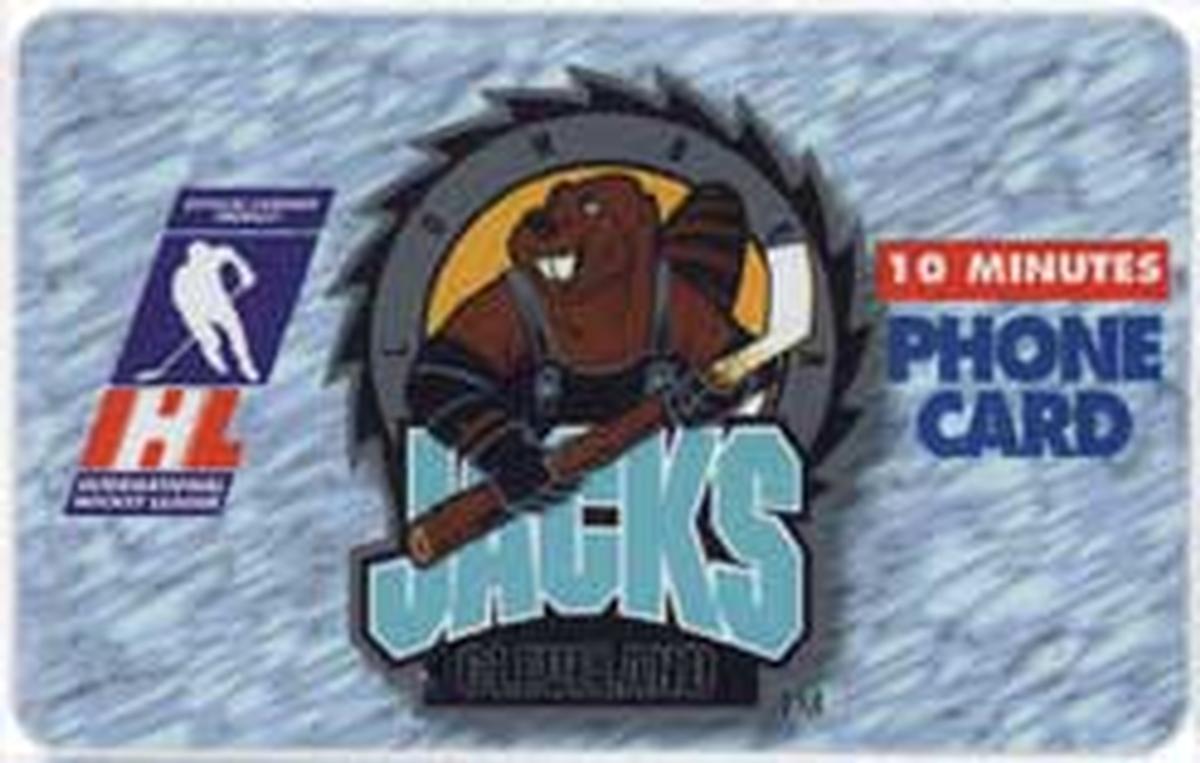 This set of collectible phone cards features logos and mascots of International Hockey League (IHL) teams from 1996. Each card has a distinctive team emblem prominently displayed on a textured blue-gray background. All cards display the official IHL logo in the lower left corner, reading "International Hockey League," along with the designation of time usage minutes in a red box. The text "PHONE CARD" is printed in bold blue letters on most cards, accompanied by the allocated minutes ranging from 7 to 10 minutes.