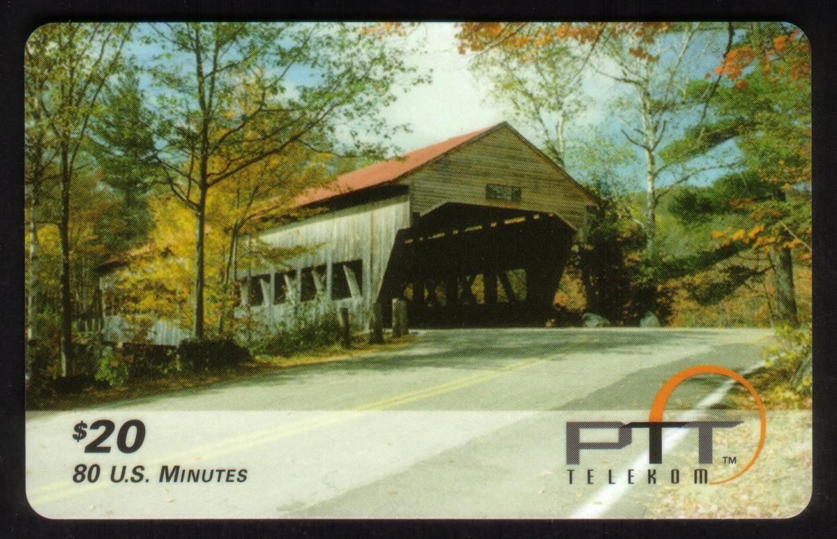 This collectible phone card features a scenic image of a covered bridge set in a rural, autumnal landscape. The bridge has a weathered wooden exterior with a red roof, nestled among trees showing fall foliage. The two-lane paved road leads directly into the entrance of the bridge, framed by natural scenery including green and yellow leaves and some barren branches.