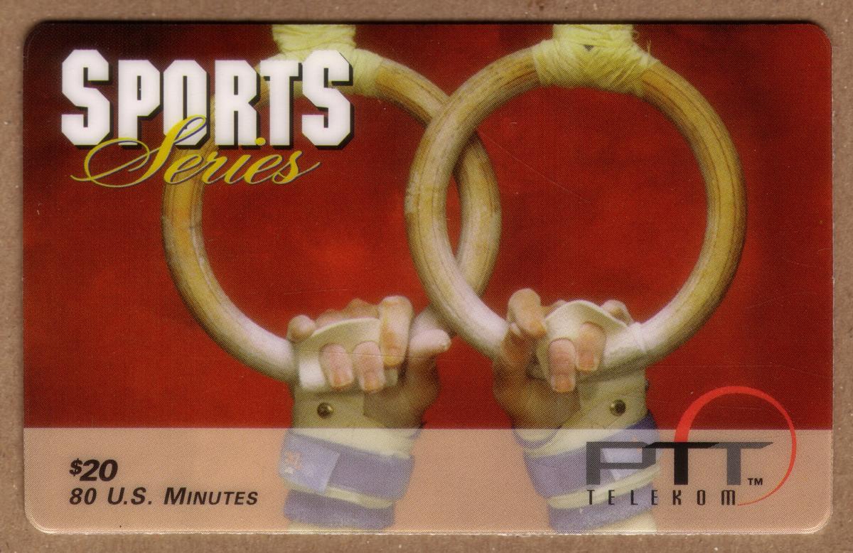 This item highlights the sport of gymnastics within a specific phone card series issued by PTT Telekom. The card’s design focuses on the strength and precision of the gymnast on the rings, providing a clear depiction of this Olympic event.