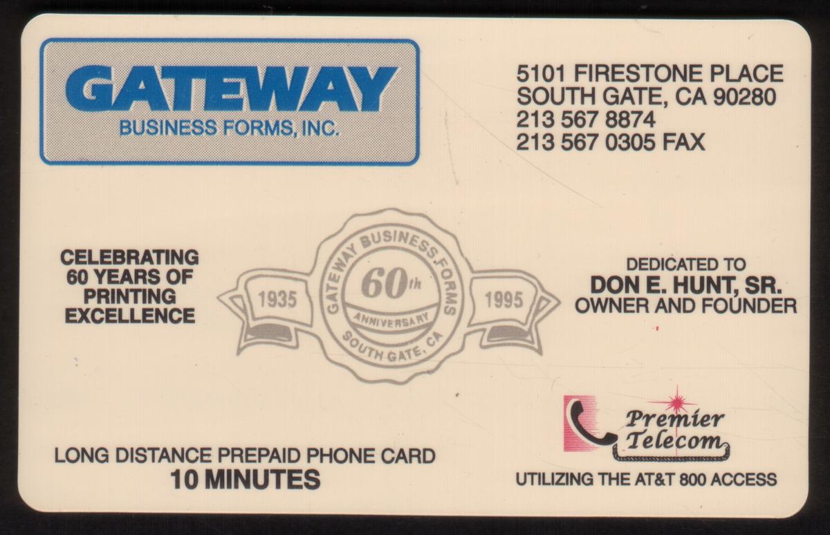 This collectible card commemorates the 60th Anniversary of Gateway Business Forms. The front features a simple design with text prominently displaying "Gateway Business Forms - 60th Anniversary Business Card SPECIMEN." The text includes corporate and promotional language highlighting the milestone. The card also references Premier Telecom, indicating a connection to telecommunications services or business.