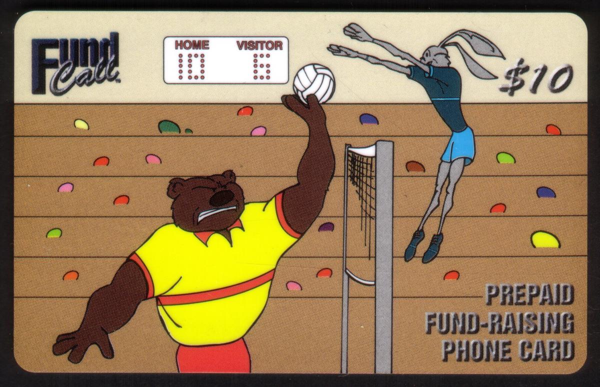 The setting is a simple volleyball court framed by a net that stretches horizontally across the card’s midsection. The net has the word "Premier Telecom" printed clearly on it, identifying the issuing company. The card also includes the denomination "$10.00" prominently placed on the lower right corner, indicating its value. Above the denomination, the words "FundCall" appear in bold letters, linking the card to a fundraising initiative.