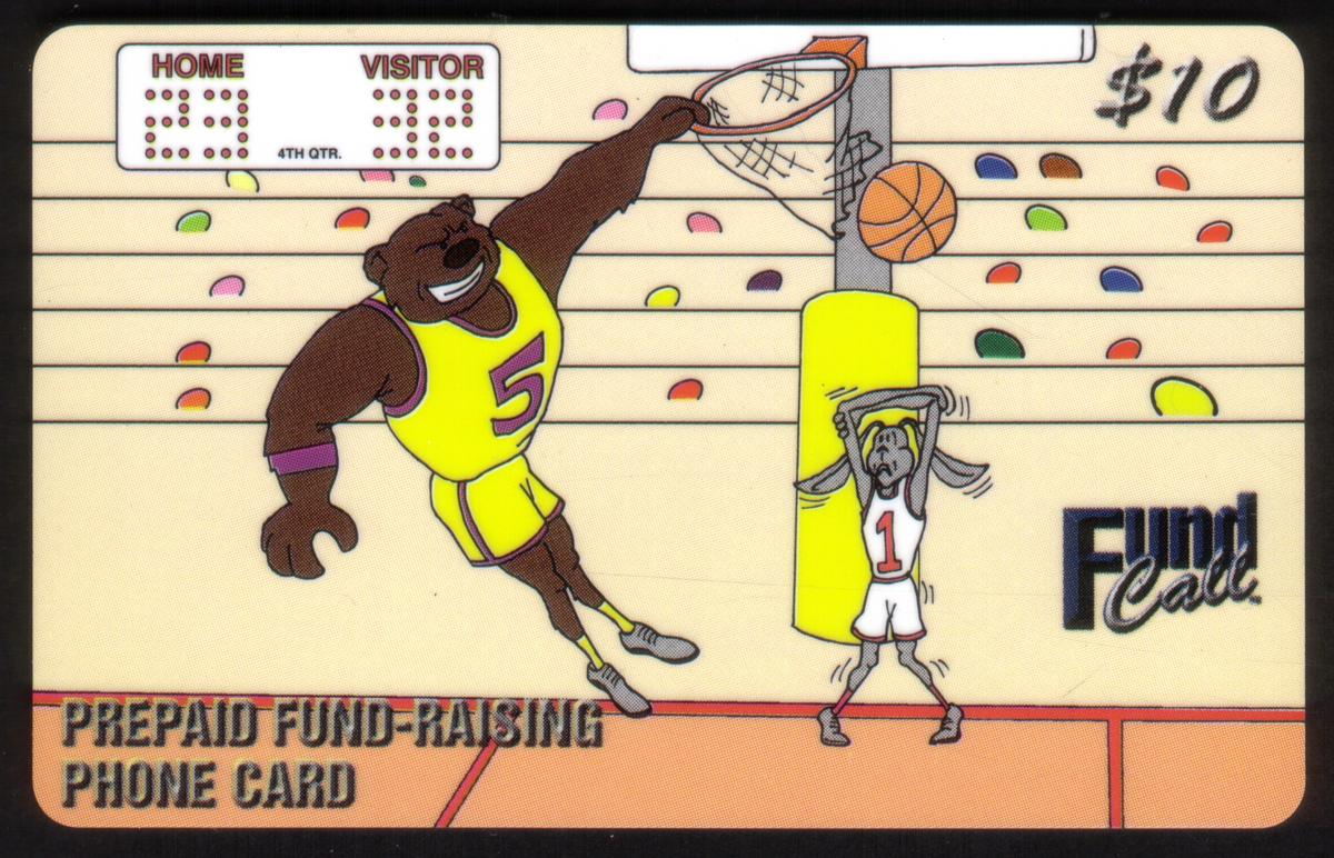 The card includes text indicating its connection to fundraising and artistic themes, specifically related to basketball. It is a specimen card issued by Premier Telecom for FundCall, with a denomination of $10.00. The card highlights the sport of basketball in a playful, cartoon format, combining both artistic and sports elements in its design.