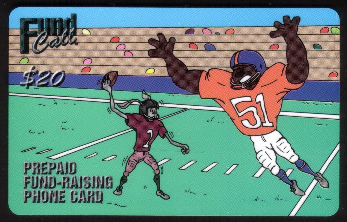 Overall, the card combines themes of fundraising, sports, and artistic cartoon design focused on football players. The use of bright colors and dynamic poses adds an energetic feel to the collectible, aligning with the fundraising and sports keywords. The specific names visible are FundCall, Premier Telecom, and WorldCom.