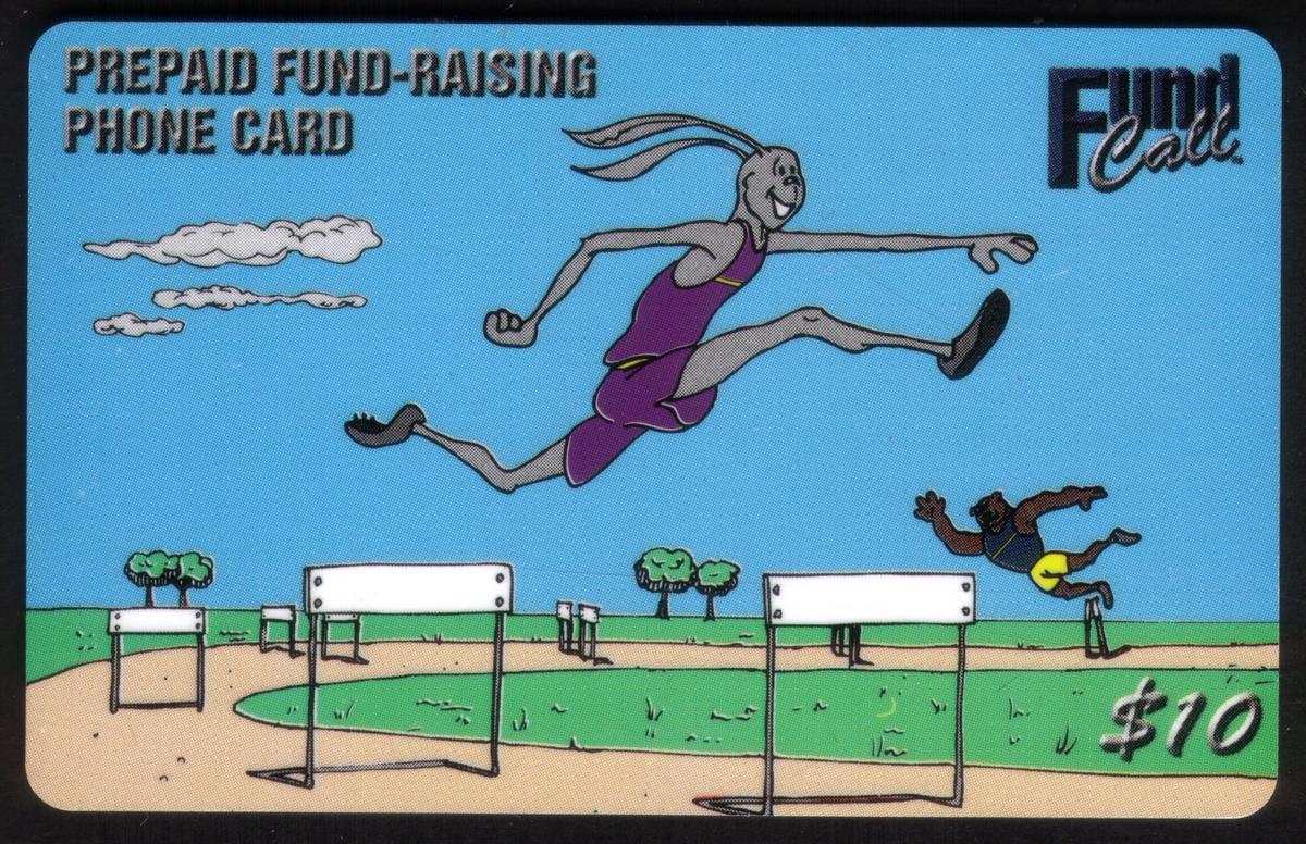 The card includes the denomination "$10.00" prominently displayed on the right side, along with the text “FundCall” above it. The word “SPECIMEN” appears diagonally across the image indicating its sample status. The upper left corner shows a cluster of text including "Premier Telecom," identifying the telecommunication company associated with the card. The layout and color scheme use bright, bold colors enhancing the cartoonish style of the athletes.