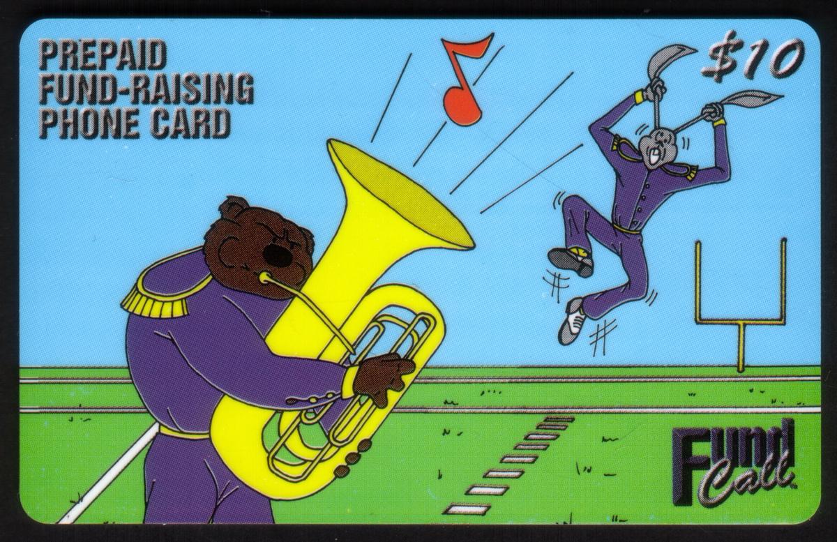 The card includes the text "$10.00 FundCall" near the bottom, along with the names "Premier Telecom" and "WorldCom." These details indicate the card’s phone card function and the companies associated with its issue. The artwork is playful and artistic, combining elements of sports—with the football player—and music with the band instruments, emphasizing a fun and energetic theme.