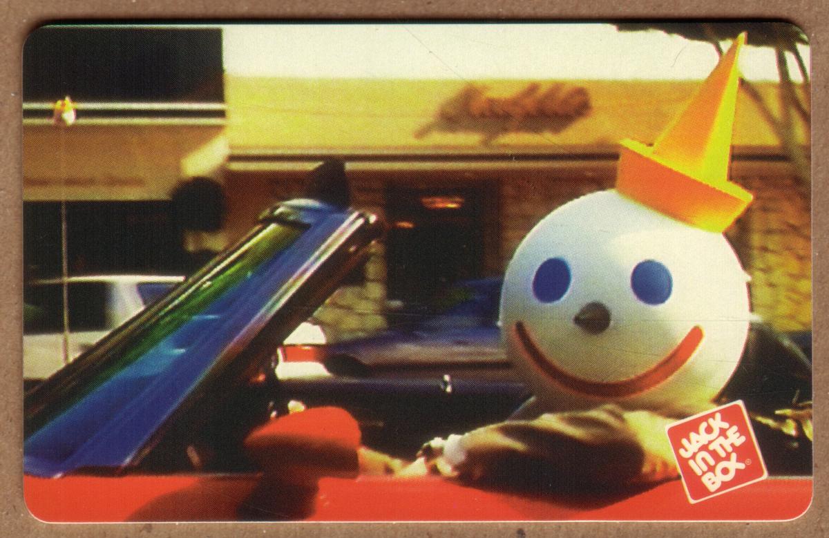 Overall, the card highlights the Jack In The Box mascot in automobile form, representing fast food and promotional collectible elements, featuring cars and branding elements tied to the restaurant chain.