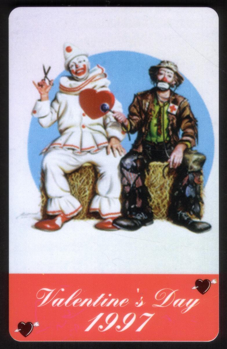 Vintage 1997 Emmett Kelly Jr. Valentine’s Day phone card featuring clowns, hearts, and circus themes with nostalgic and collectible appeal. |