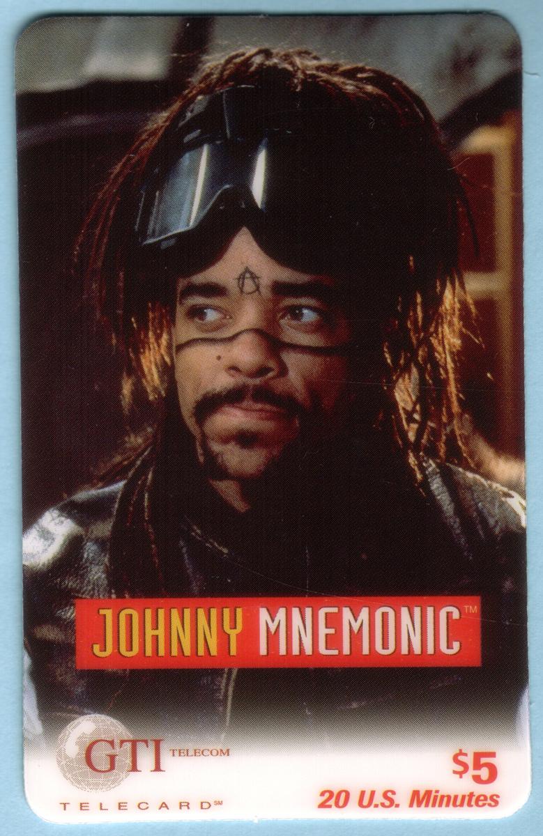 This set of four collectible GTI Telecom telecards features promotional images from the movie "Johnny Mnemonic," a futuristic film starring Keanu Reeves and Dolph Lundgren. Each telecard is marked with the "Johnny Mnemonic" title in bold red and white lettering across the lower portion and each includes the GTI Telecom logo and denomination with U.S. minutes indicated.