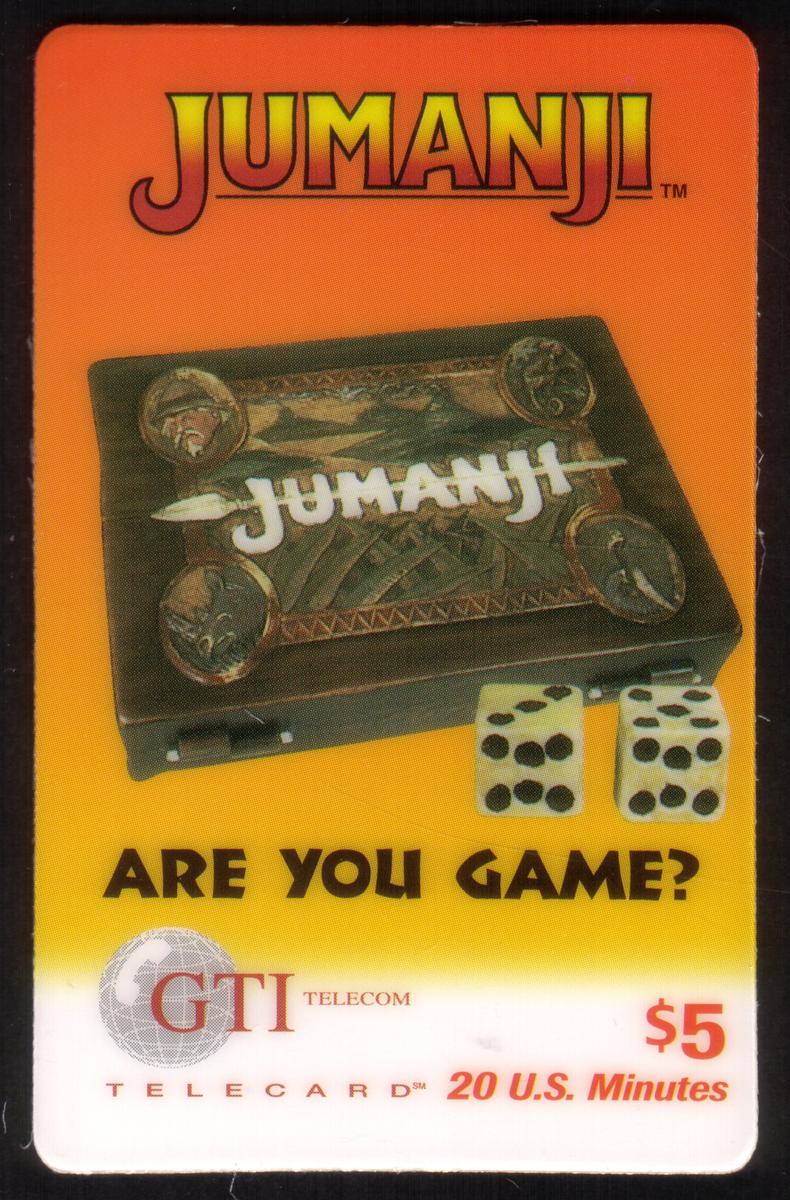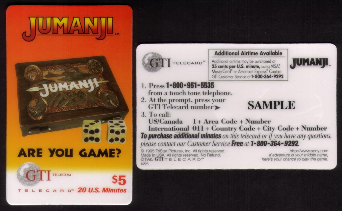 This phone card is a part of a series related to Hollywood movies and famous characters, specifically connected to the Jumanji series. It incorporates themes of entertainment, family, adventure, action, fantasy, and comedy, and is produced under the association of TriStar Pictures.