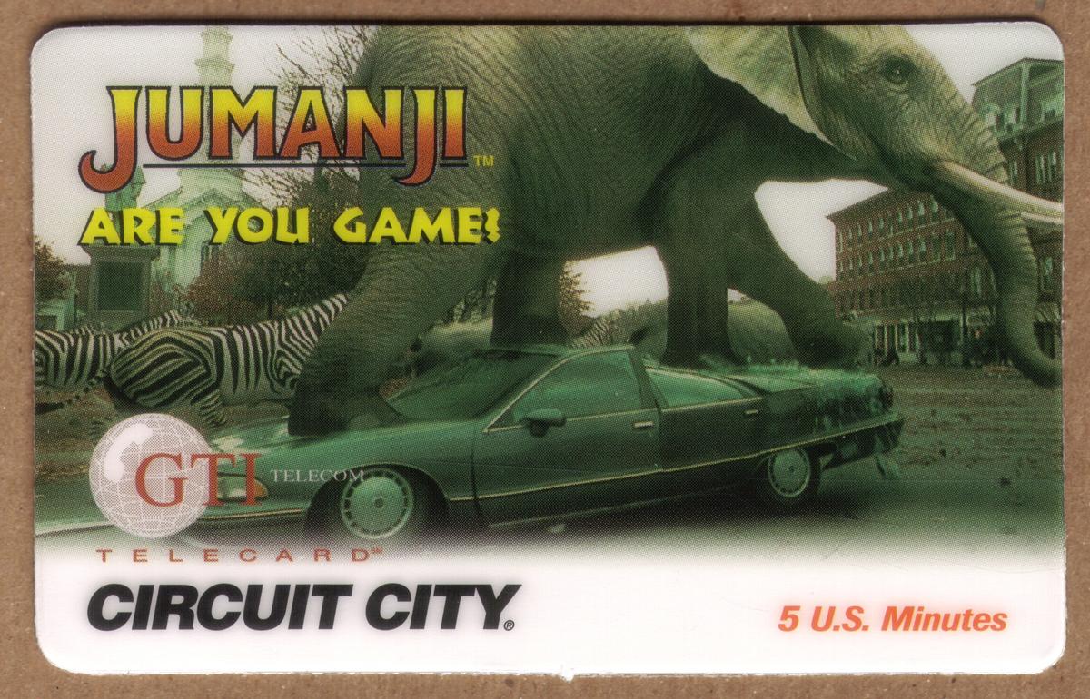 Promotional Jumanji phone card featuring a wild elephant scene, urban background, and 5 U.S. minutes, blending entertainment with practical telecommunication utility. |