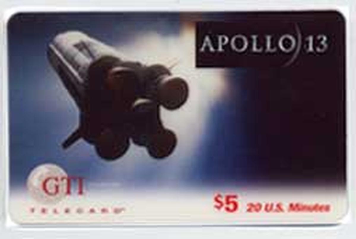 This phone card combines NASA photographs and Hollywood entertainment by featuring imagery tied to the Apollo 13 film while highlighting real space exploration hardware. It serves as a tribute to outer space, rockets, and NASA’s aeronautical achievements during the historic moon mission.