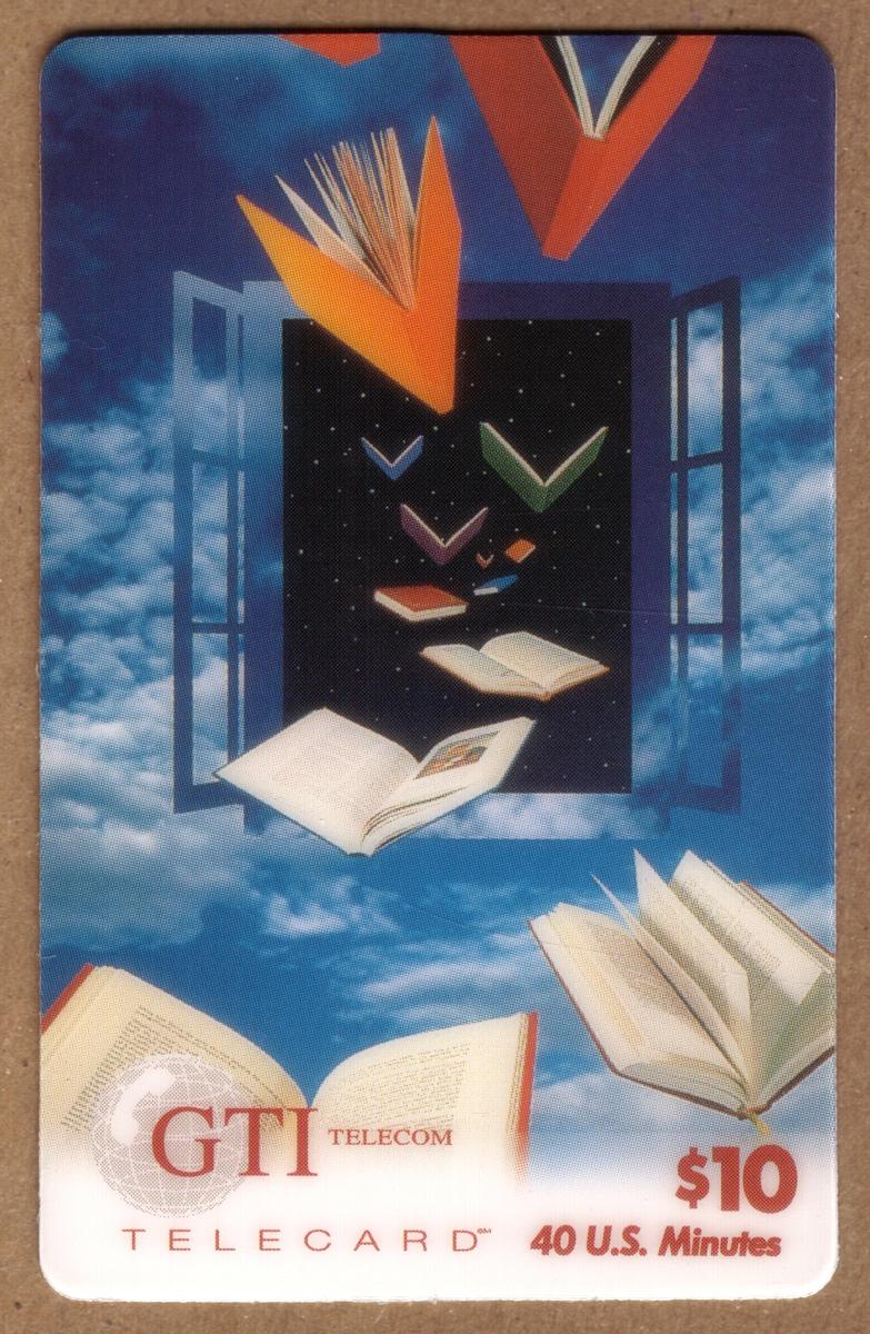 The card includes the logo and name of GTI Telecom, Inc. prominently on the front. A denomination of $10 is printed on the lower left corner of the card. The overall appearance is bright and engaging, with an emphasis on the uplifting power of books and reading.