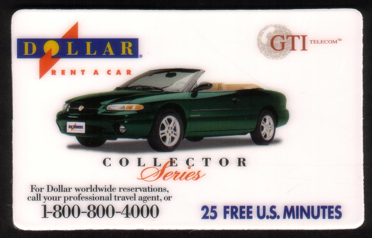 Also visible on the card is the name GTI Telecom, Inc., a company associated with telecommunications. The overall design emphasizes travel and transportation, reflecting both the Dollar Rent-A-Car brand and the Chrysler Sebring convertible as symbols of automotive travel. The combination of logos, trademarks, and the car itself makes this an automotive collectible tied to business cards in the transportation industry.