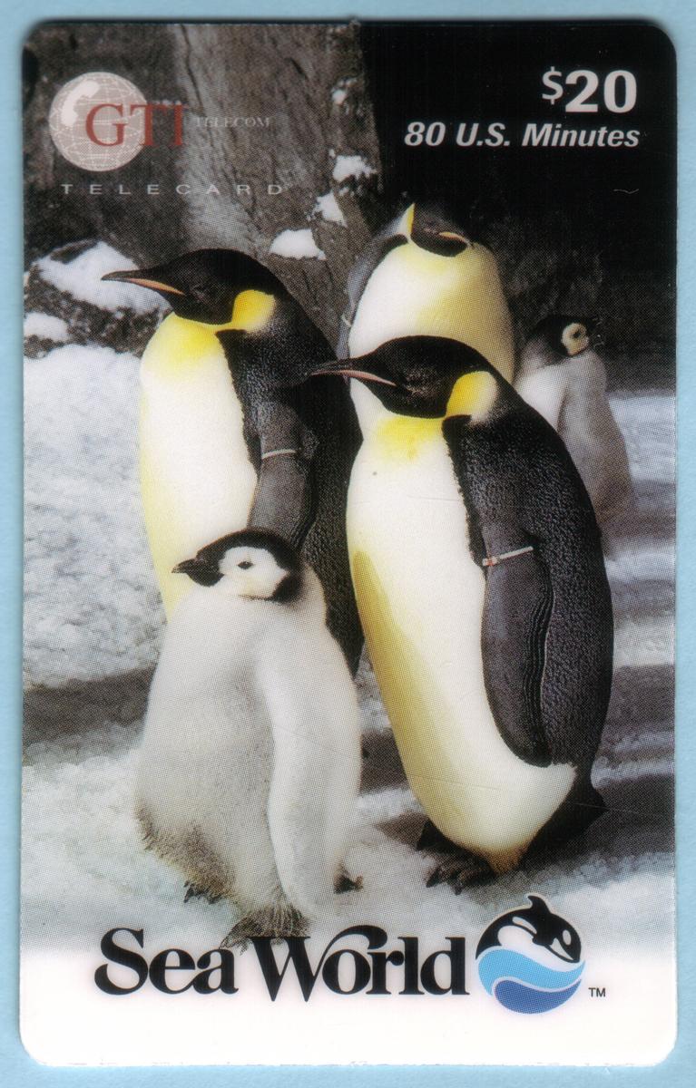 SeaWorld Wild Arctic Emperor Penguins phone card featuring marine life, conservation themes, and 80 U.S. minutes, ideal for collectors, travelers, and wildlife enthusiasts. |