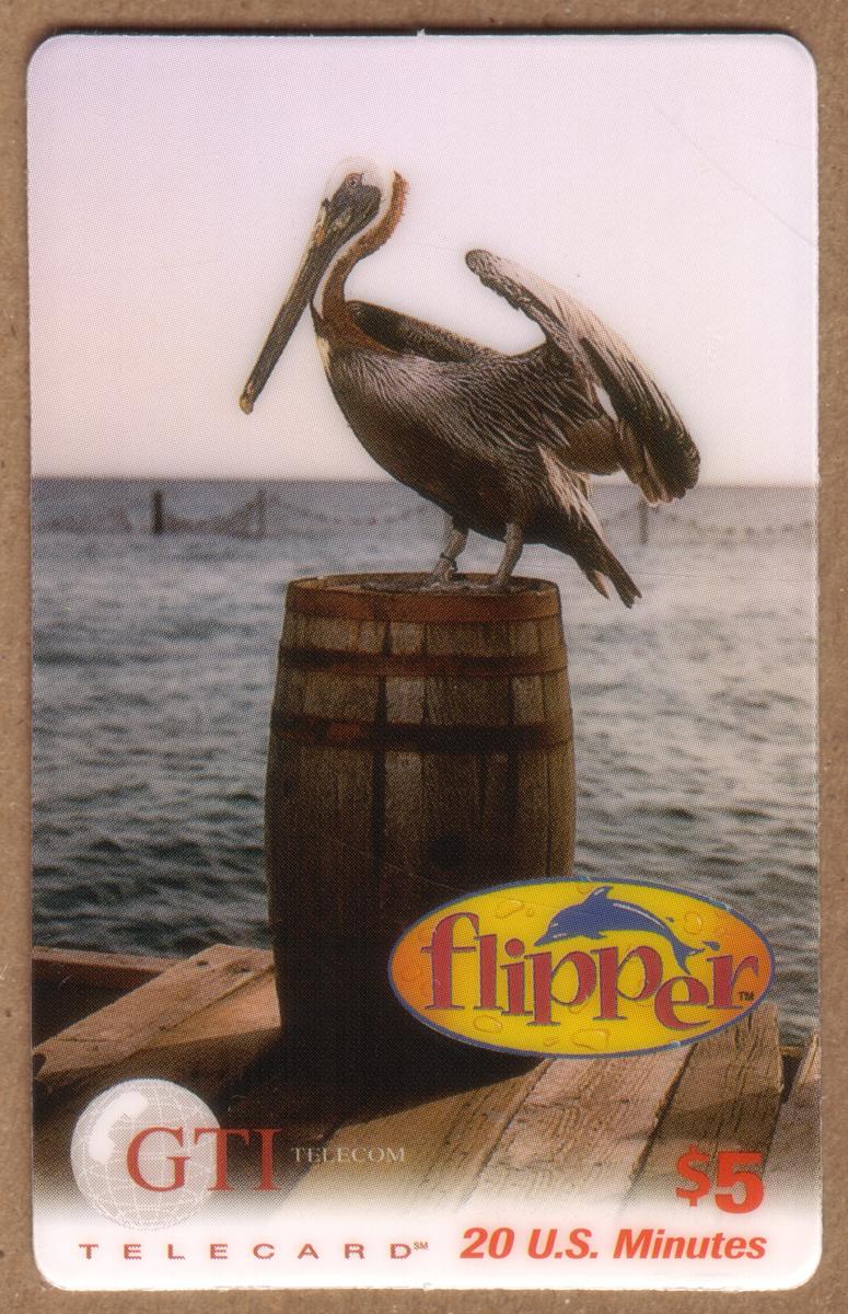 The phone card is issued by GTI Telecom, Inc. and is valued at $5. The card belongs to the Flipper Series, which is indicated as part of its theme or collection. The design incorporates elements related to birds, specifically centered on Pete the Pelican as the main subject.