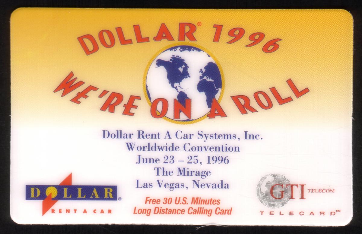 This collectible phone card features promotional imagery associated with the Mirage Hotel in Las Vegas. The card prominently showcases the logos and trademarks related to Dollar Rent A Car. The text on the card references the "30m Dollar Rent A Car 1996 World Convention" along with the slogan "We're On A Roll." Additionally, GTI Telecom, Inc. is mentioned, indicating the telecom company involved with this card.