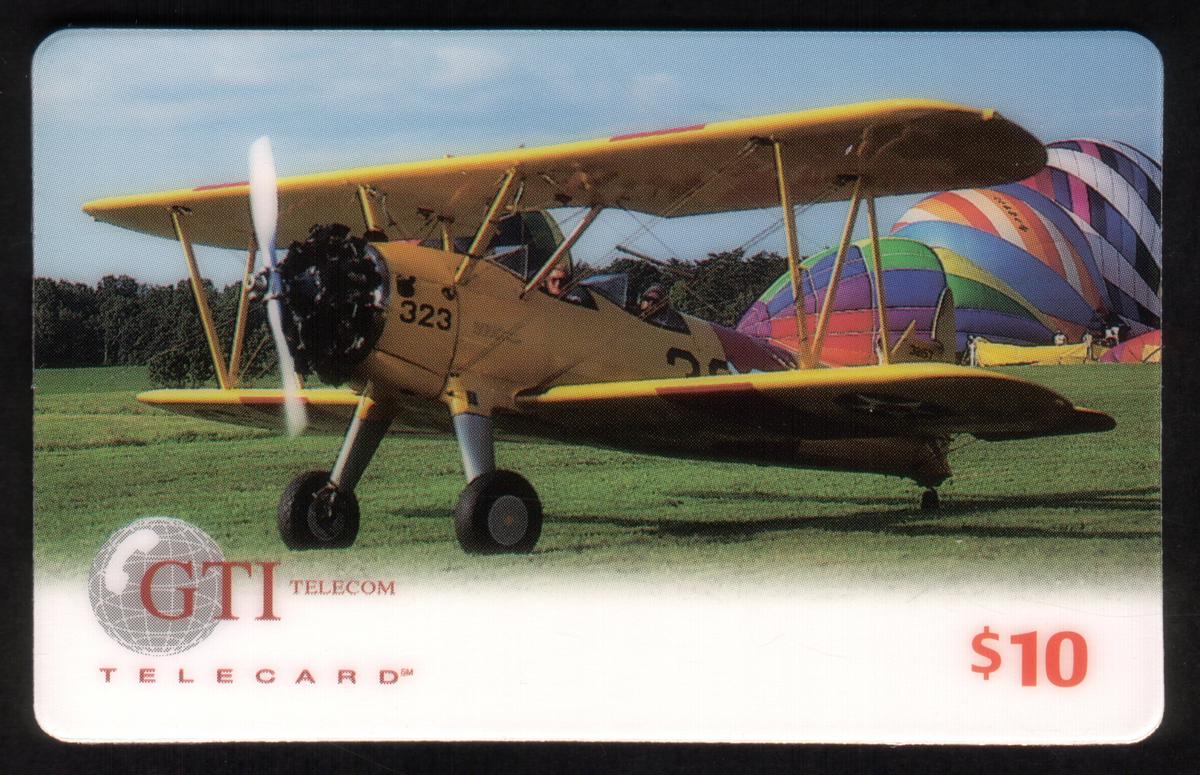 The card includes printed text reading "GTI Telecom, Inc." in the lower portion, denoting the telecommunications company. The denomination "$10" is indicated on the card, confirming its monetary value. The overall design blends elements of transportation by air, highlighting both historic and recreational flying equipment.
