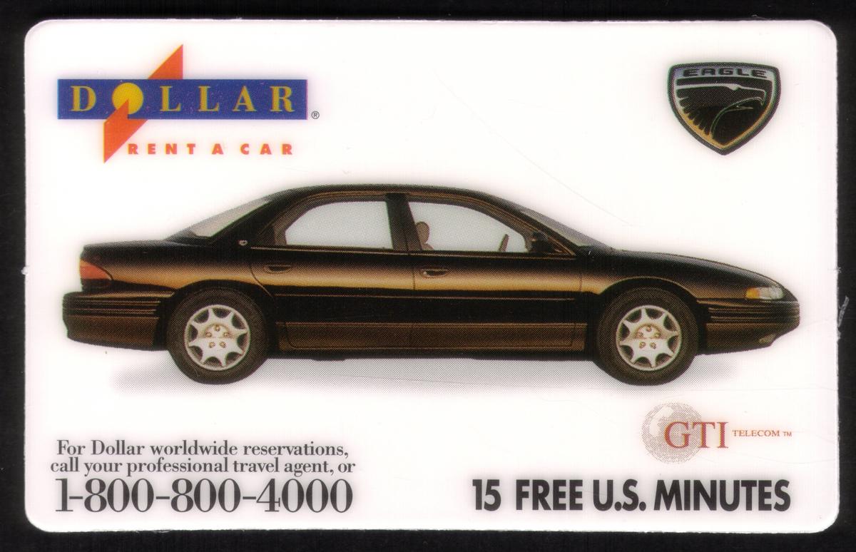 On the right side of the card, "GTI Telecom, Inc." is printed near the top, identifying the telecom company associated with the card. Beneath that, the card’s branding includes "Chrysler Eagle" written prominently in white text. Additional fine print and logos reinforce the association with the automotive and rental car business. The card’s layout and colors emphasize the promotion of Dollar Rent-A-Car using the Chrysler Eagle Vision as a featured automobile.