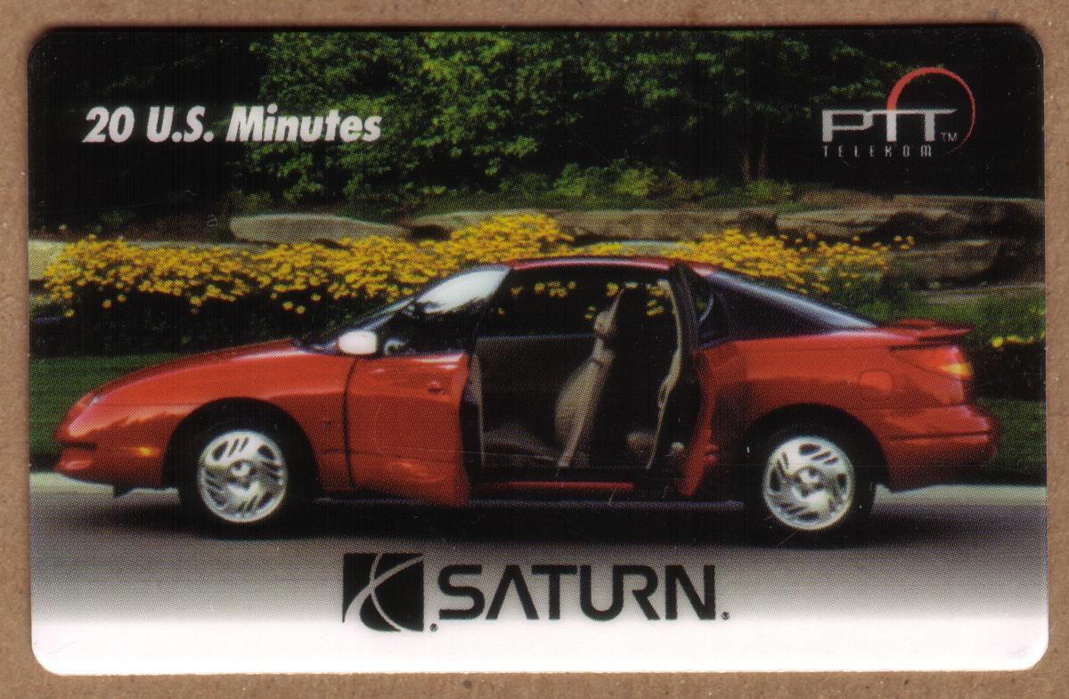 This promotional phone card highlights the Saturn automobile brand and its corporate identity, combining both imagery and trademarks to signify the vehicle and the telecommunication service.