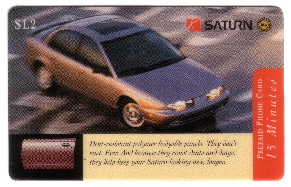 The card’s content is directly connected to transportation and automobiles, specifically highlighting Saturn automobiles and their technological advancement in dent resistance. The use of the network provider PTT Telekom indicates its function as a collectible phone card with a preset value. The card’s design merges practical telecommunications usage with brand promotion for Saturn’s innovative polymer body technology.