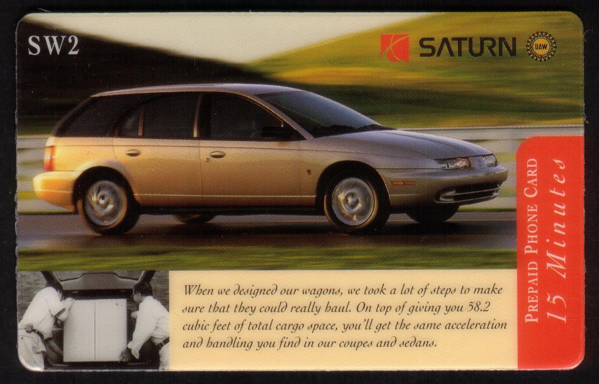 This phone card is part of a broader series that focuses on transportation and corporate advertisements for Saturn automobiles. The visual presentation and textual details make it a collectible item that highlights the specific model and practical aspects of the Saturn SW2 Station Wagon through official corporate trademarks and promotional wording.