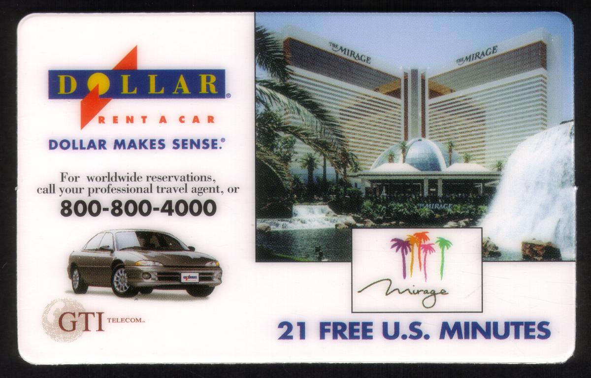 The bottom right corner of the card indicates the telecommunications value with the text "21 FREE U.S. MINUTES," showing the prepaid calling time available on this phone card. The design combines travel, lodging, and automobile rental themes, making it a promotional item associated with Dollar Rent A Car and the Las Vegas Mirage Hotel.