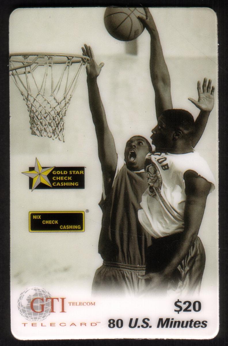 The card prominently displays the $20 denomination in gold lettering at the bottom right corner. Above the image, “Gold Star Check Cashing” is printed, indicating a promotional connection. At the top left corner, the text “Photo Two Men Playing Basketball SAMPLE” appears, identifying the photograph and its subject. Additionally, the card includes business logos from GTI Telecom, Inc. and WorldCom, represented in stylized fonts. These corporate names suggest the card’s promotional or sponsorship nature tied to the basketball-themed image.