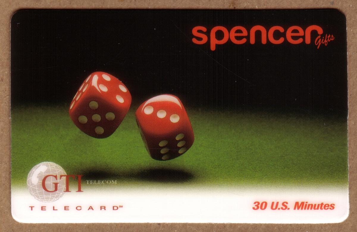 Overall, the design integrates elements of gambling and gaming, with clear branding from GTI Telecom, Spencer’s Gifts, and WorldCom. The presence of the terms “dice,” “die,” and “games” aligns with the visual of the dice and the promotional purpose indicated by the card’s use of business logos and trademarks.