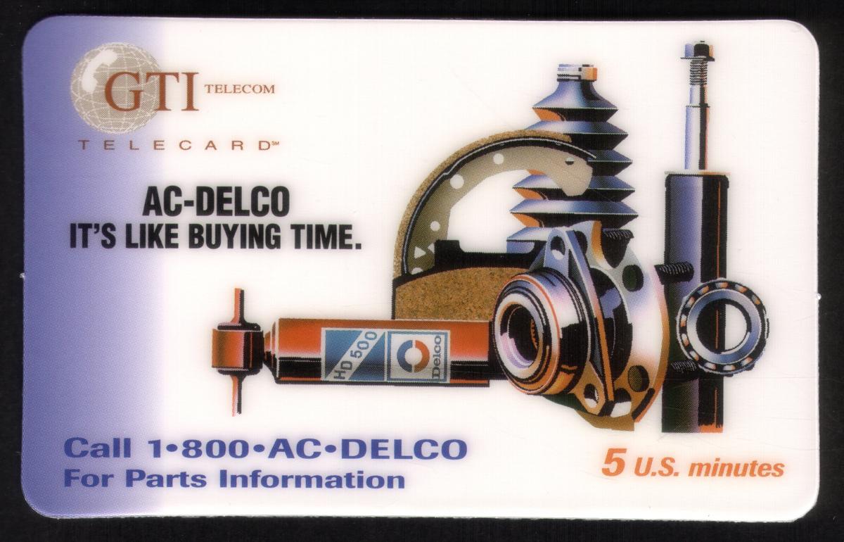 This collectible phone card is dedicated to the automotive brand AC Delco, prominently displaying the company's logo and tagline “It’s Like Buying Time.” The design includes a visual reference to automotive parts, specifically brakes and shocks, highlighting the brand’s connection to vehicle maintenance and repair components. The card also features the phrase "Brakes & Shocks SAMPLE" and identifies GTI Telecom, Inc. as the service provider.