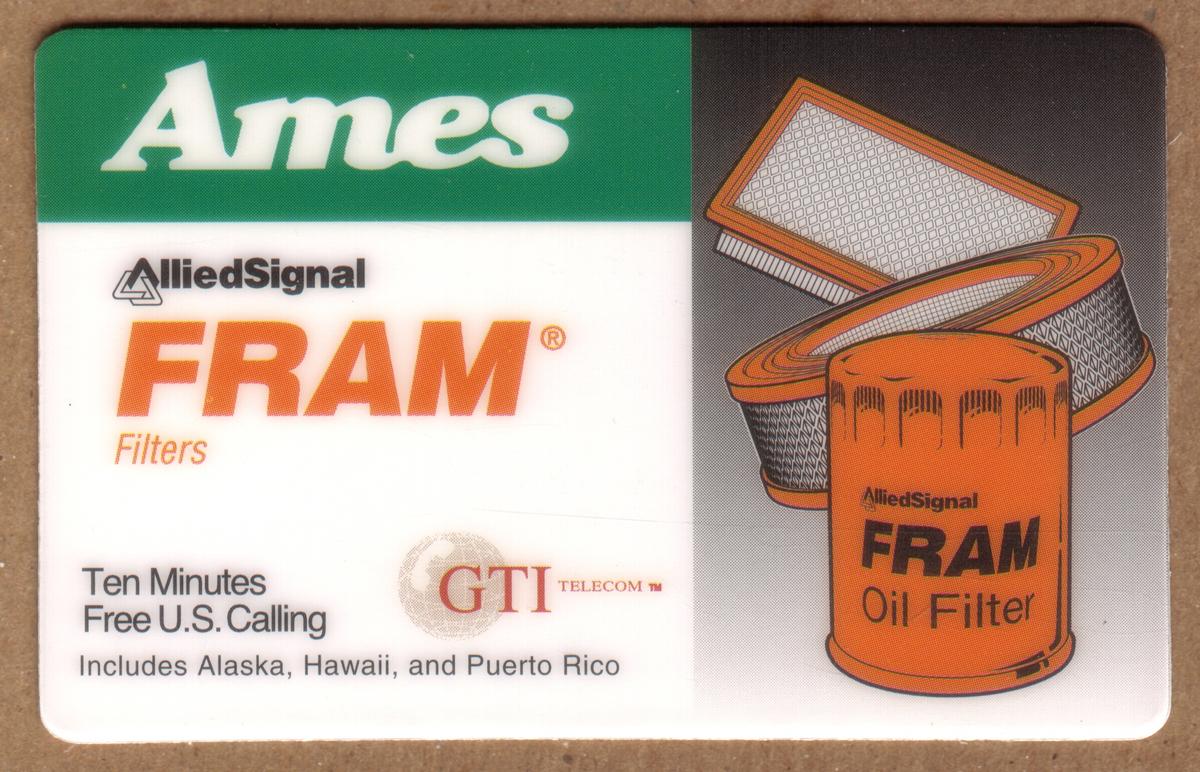 Overall, this collectible card serves as a promotional or advertising item for Ames Fram Oil & Air Filters and Allied Signal, featuring a clear representation of automotive parts and branding, along with the involvement of GTI Telecom, Inc.