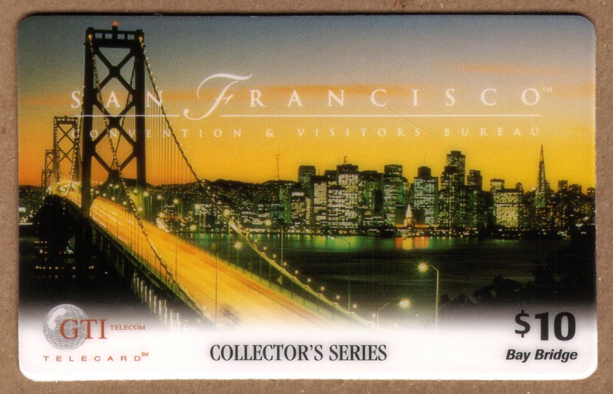 Prominently displayed on the card is the logo and name of the San Francisco Convention & Visitors Bureau, reinforcing the card’s connection to tourism promotion. The card is part of a collector’s series issued by GTI Telecom, Inc., and it carries a monetary value of $10. The word “transamerica” appears on the card, linking it visually to the famous Transamerica Pyramid, a signature element of the San Francisco skyline.