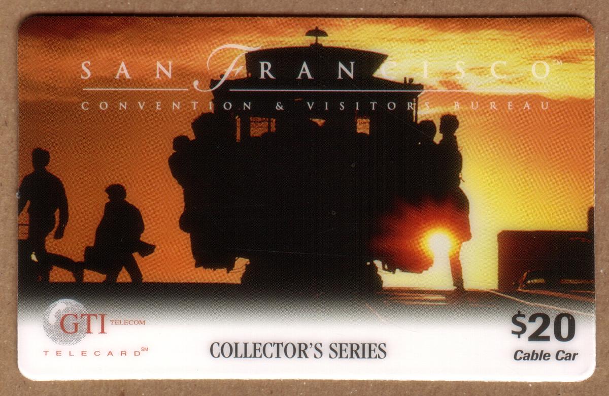 The backdrop includes a clear view of the hilly urban landscape that San Francisco is known for, with additional buildings and trees visible under the deepening blue sky. The card includes printed text mentioning "San Francisco Convention & Visitors Bureau," emphasizing the city’s status as a key tourist destination. The words "Cable Car" and "GTI Telecom, Inc." are also present on the card. The $20 denomination is displayed in the upper right corner, indicating the card’s value for use.