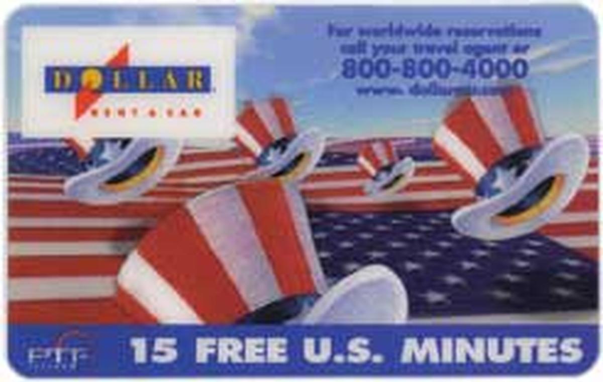 The card also includes text elements such as "15m Dollar Rent-A-Car" and "15 Free U.S. Minutes," indicating its telecommunication value. The PTT Telekom logo is visible, confirming the card's origin or issuance by this telecommunications provider. The card’s layout balances the graphic elements with these clear textual details, maintaining a patriotic focus throughout.