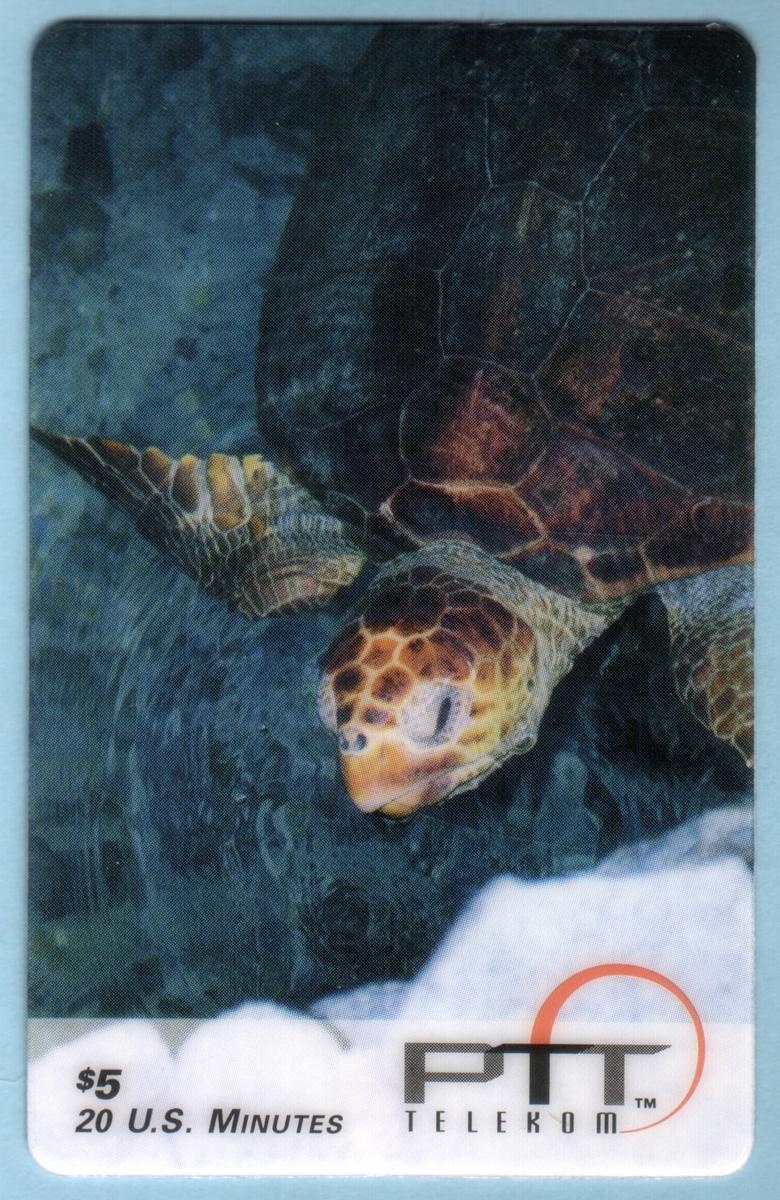 This phone card is a factual representation of the loggerhead turtle and includes clear branding elements from PTT Telekom. The value designation and imagery make it a collectible piece related to marine wildlife, specifically featuring this species of sea turtle.