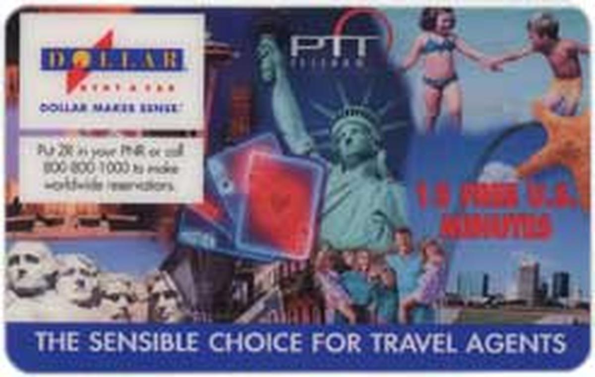 The card contains text in the lower right section reading “15m Dollar Rent-A-Car Promo: 'The Sensible Choice For Travel Agents'” with the PTT Telekom logo above it. The name “WorldCom” appears on the upper right, indicating affiliation or sponsorship. The overall visual combines Americana landmarks, recreational imagery, and a promotional message in a colorful and engaging layout.