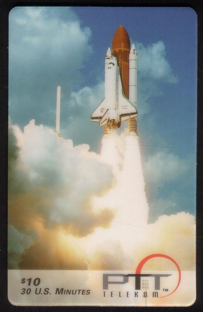 The card is marked with a value of $10 for 30 U.S. minutes of calling time. The bottom right corner displays the logo "PTT Telekom" with a red arc encircling the letters "PTT." The overall design emphasizes space exploration and NASA’s space shuttle program, reflecting themes of aerospace engineering and Kennedy Space Center launches in Florida.