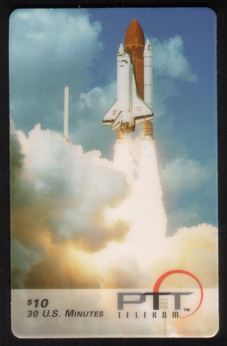 This phone card represents themes including space exploration, NASA, the Kennedy Space Center in Florida, shuttles, launches, and aerospace engineering. It is a collectible item connected to space programs and Florida attractions, capturing a classic moment of astronautical achievement through the iconic space shuttle launch.