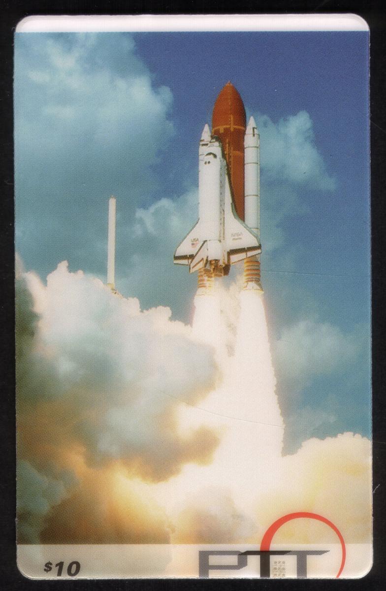 This collectible phone card features a dramatic photographic image of a NASA Space Shuttle launch at Kennedy Space Center in Florida. The shuttle is captured in the moment of liftoff, with bright flames and thick smoke billowing from the rocket engines against a clear blue sky. The scene reflects the intense power and engineering behind NASA’s space exploration and shuttle programs.