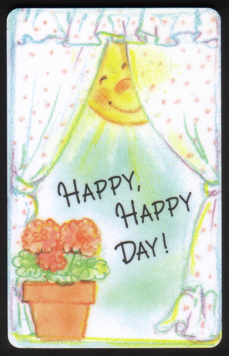 This collectible greeting card titled "Happy, Happy Day" features vibrant artwork centered on a cheerful sunrise scene. The main visual elements include a bright sun rising behind large, vivid flowers and green plants. The florals are drawn with artistic detail, showcasing colorful petals in shades of yellow and orange, with lush green leaves surrounding them. The image conveys a sense of warmth and celebration, fitting for a birthday greeting.